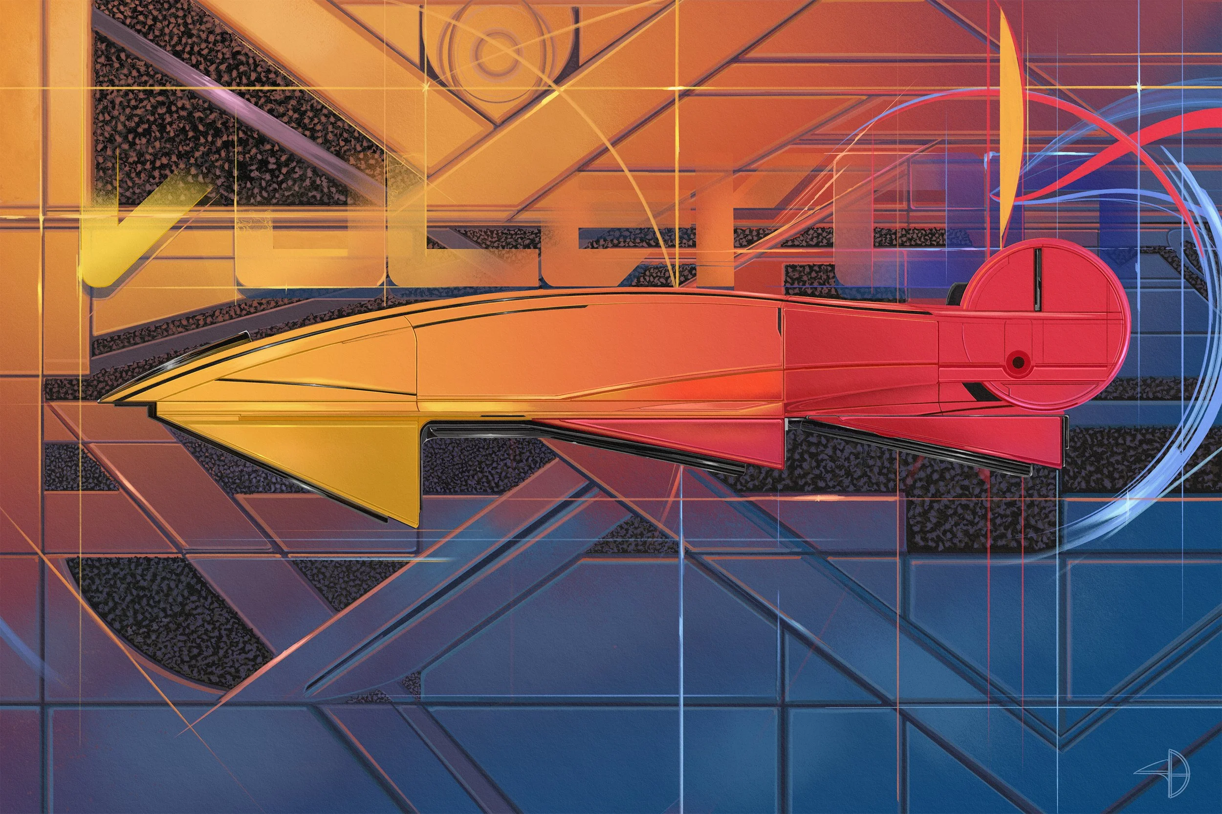 Voltron came from wanting to design something that felt genuinely ceremonial about speed. Not aggressive. Ceremonial. The nose is a stacked arrow — multiple blade planes converging to a single point, gold against the gradient burn of the body as it transitions from yellow through orange into that deep turbine red at the rear. The color itself is doing aerodynamic storytelling, heat building from bow to stern. That rear circular cowling is the centerpiece decision. Cylindrical, blunt, deliberate — completely counter to conventional LSR tail taper logic. It references jet engine housing, but more than that it gives the vehicle a visual anchor. Something for the eye to land on after traveling the full length of the body. Without it the design would simply disappear at the trailing edge.
