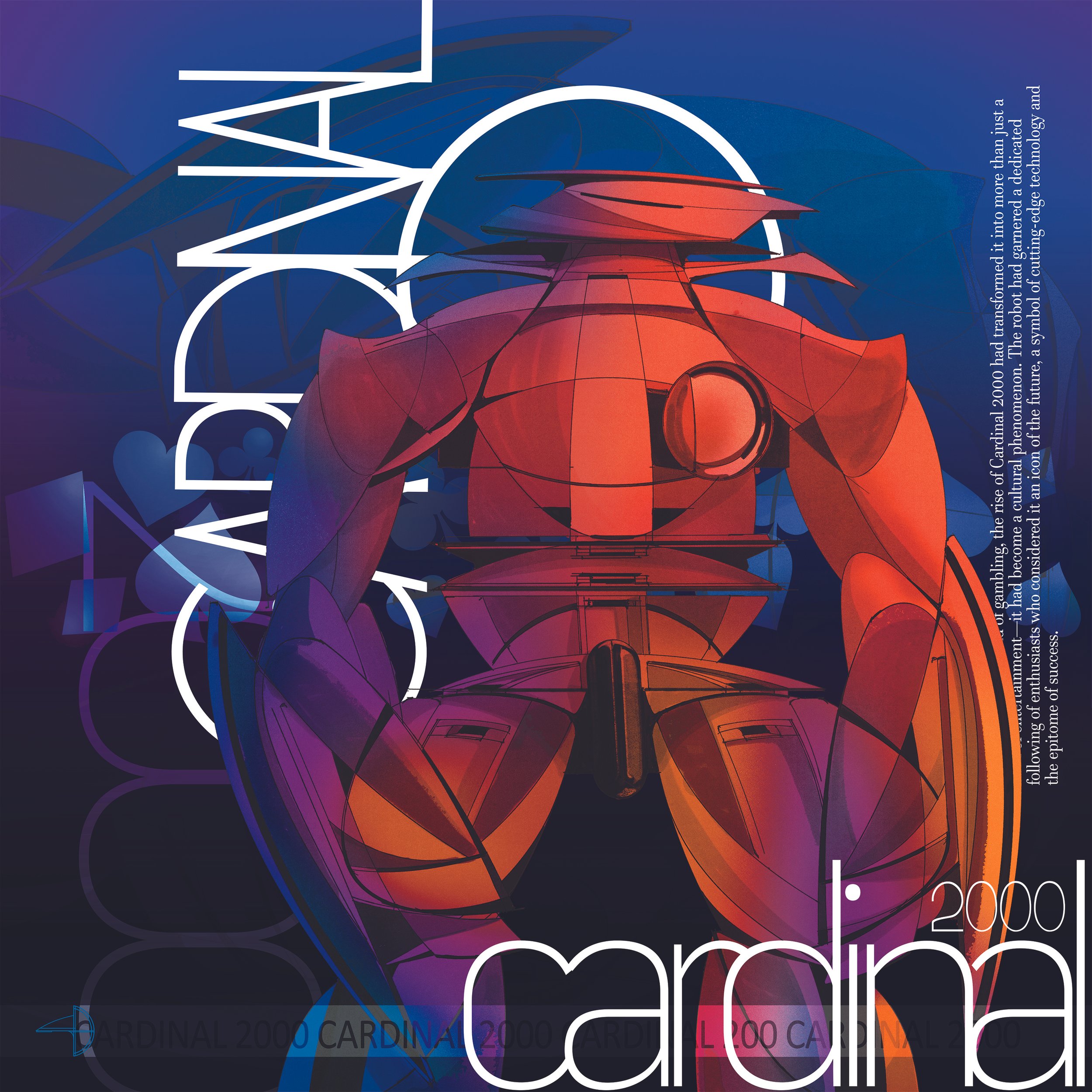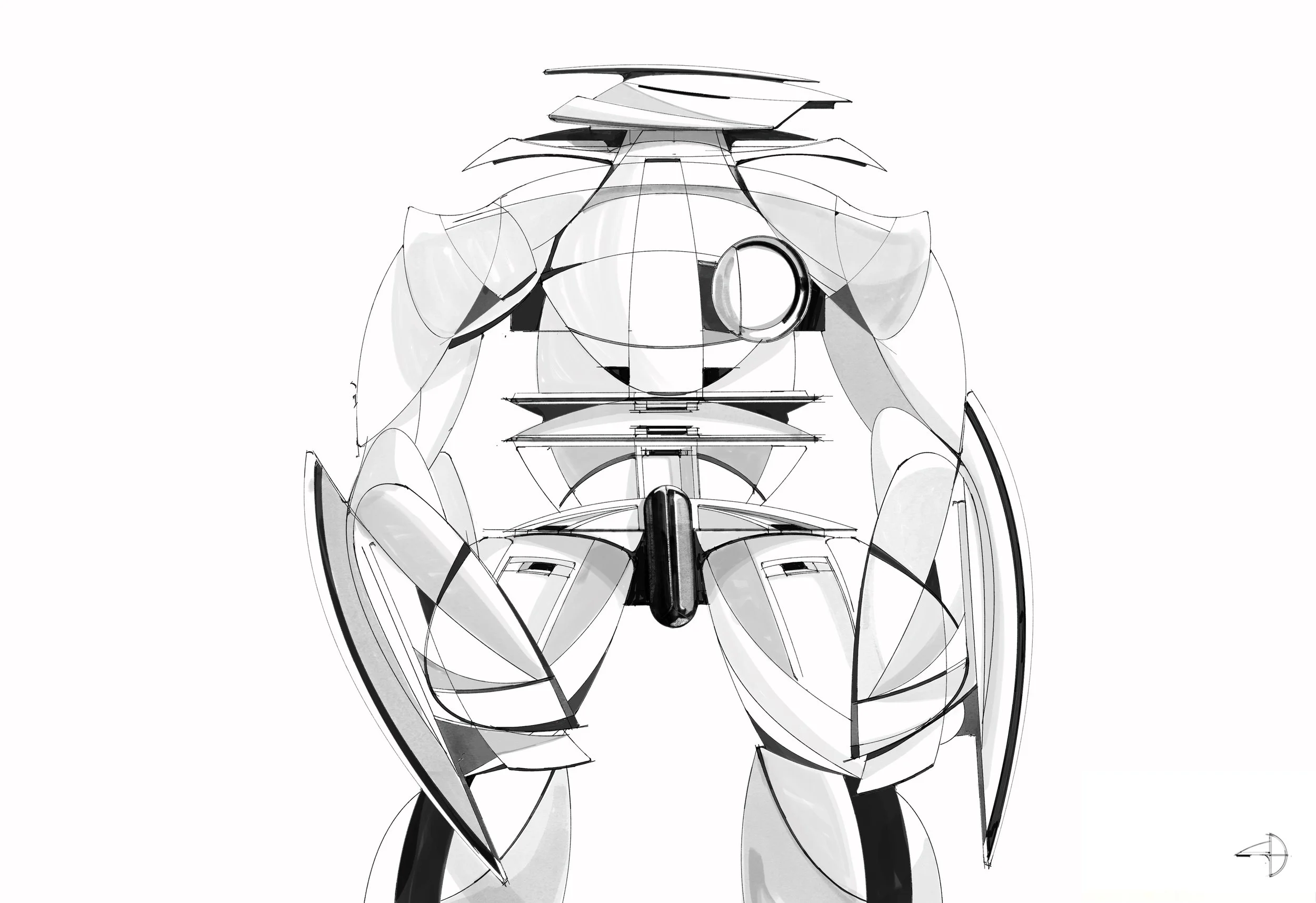 Cardinal exists inside the Jetsens universe as something between guardian and enigma. Not a vehicle, not quite a figure — a mechoid. A constructed presence with its own internal logic. The front view was a deliberate choice. No profile, no three-quarter comfort. Straight on, symmetric, confrontational. Every surface is compound-curved and overlapping — petal-form armour panels radiating outward from a central torso axis, chrome catching light from directions that don't quite make sense. That disorientation is intentional. The circular aperture at the chest reads as both optical sensor and void. You're not sure if Cardinal is looking at you or through you. Designing within a lore system gives you permission to let forms be unexplained. Not every surface needs a functional justification — some geometry exists because the world Cardinal inhabits demands it. That freedom produced some of the most instinctive linework in this series.