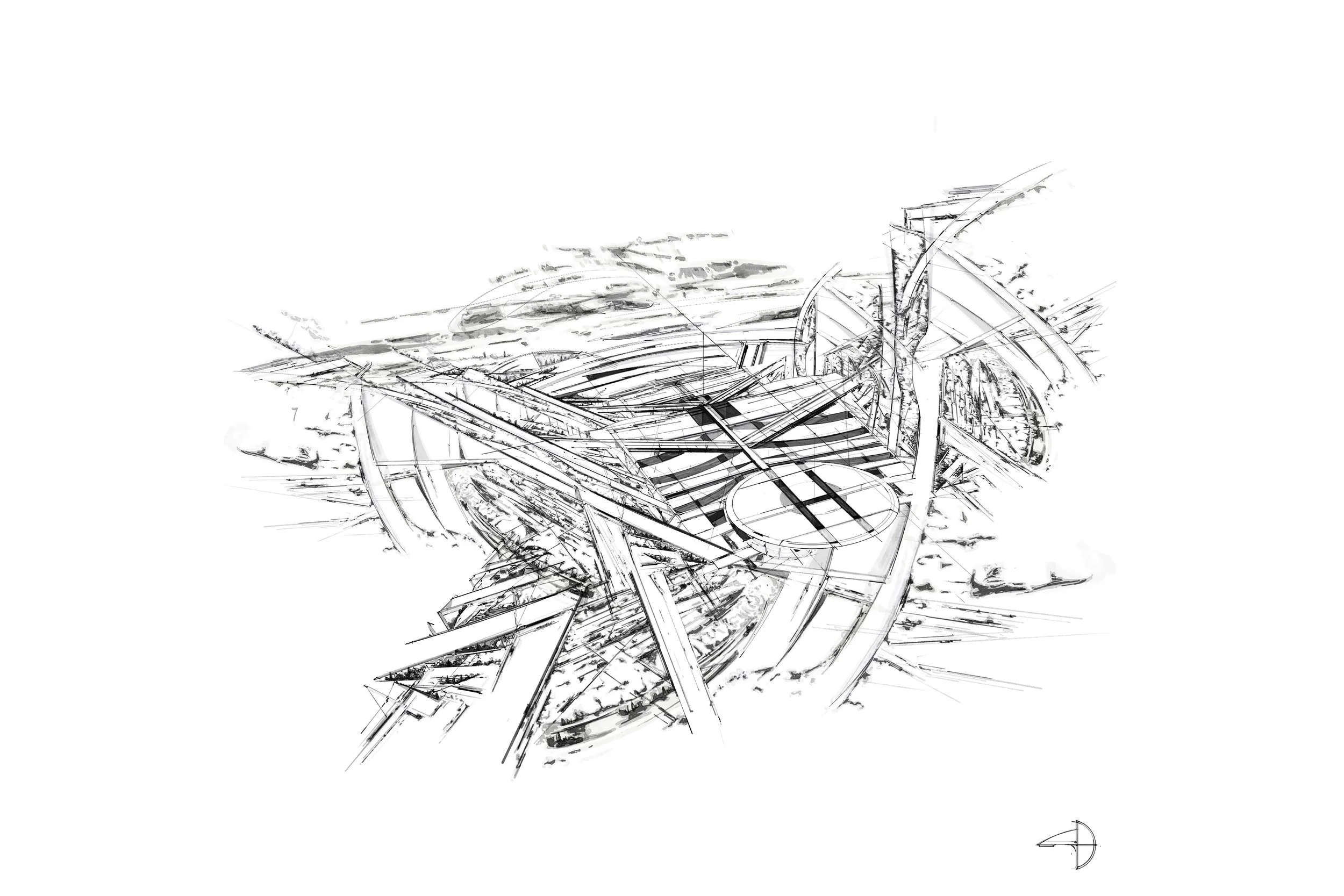 Sky Port is where you arrive. Aerial view, total chaos of structure — razor spines radiating outward from a central docking platform, layered ribbed canopies stacking over each other like a creature mid-motion. The circular landing disc at the core is the only moment of calm in the entire composition. Everything else is kinetic.